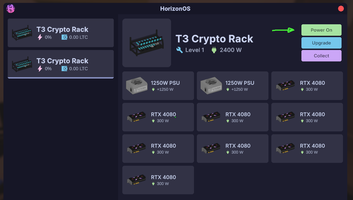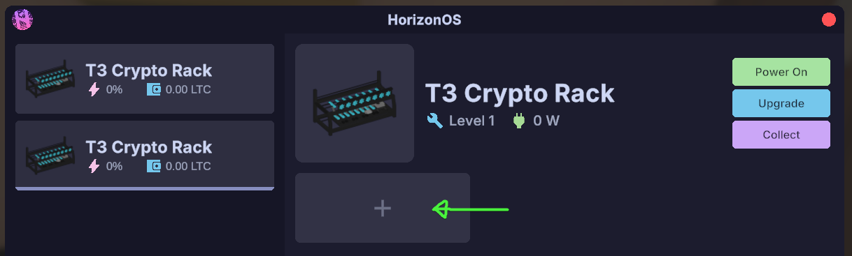 You can upgrade your Crypto Rack by clicking the Upgrade button on your Laptop. Upgrading improves efficiency and mining speed for the rack.